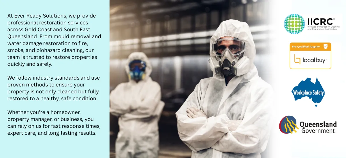 Yes. Ever Ready Solutions is a QBuild-registered, fully insured contractor with certified training in mould remediation, flood restoration, and hazardous cleaning. Our team follows national health and safety guidelines and wears full PPE for every job. We also provide professional cleaning reports for real estate agencies, insurance companies, and compliance purposes.